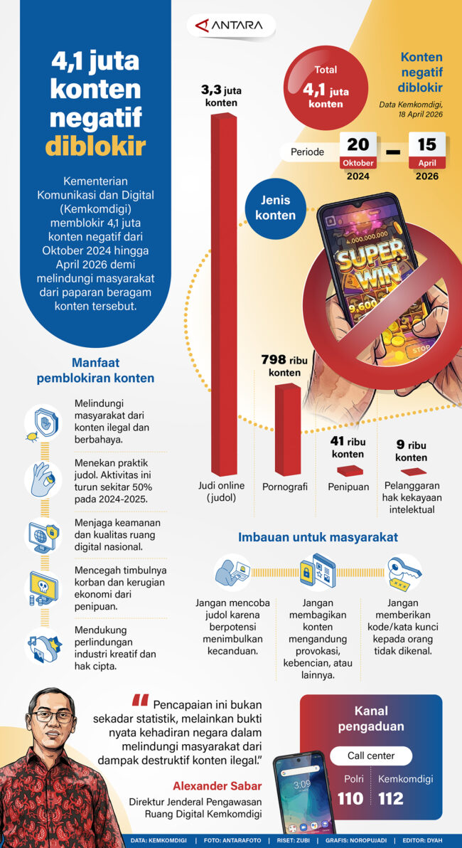 Kementerian Komunikasi dan Digital (Kemkomdigi) memblokir 4,1 juta konten negatif dari Oktober 2024 hingga April 2026 demi melindungi masyarakat dari paparan beragam konten tersebut.