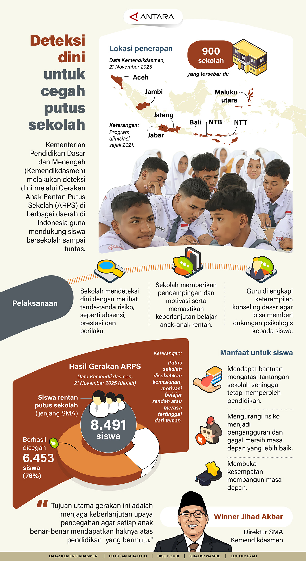 Kementerian Pendidikan Dasar dan Menengah (Kemendikdasmen) melakukan deteksi dini melalui Gerakan Anak Rentan Putus Sekolah (ARPS) di berbagai daerah di Indonesia guna mendukung siswa bersekolah sampai tuntas.