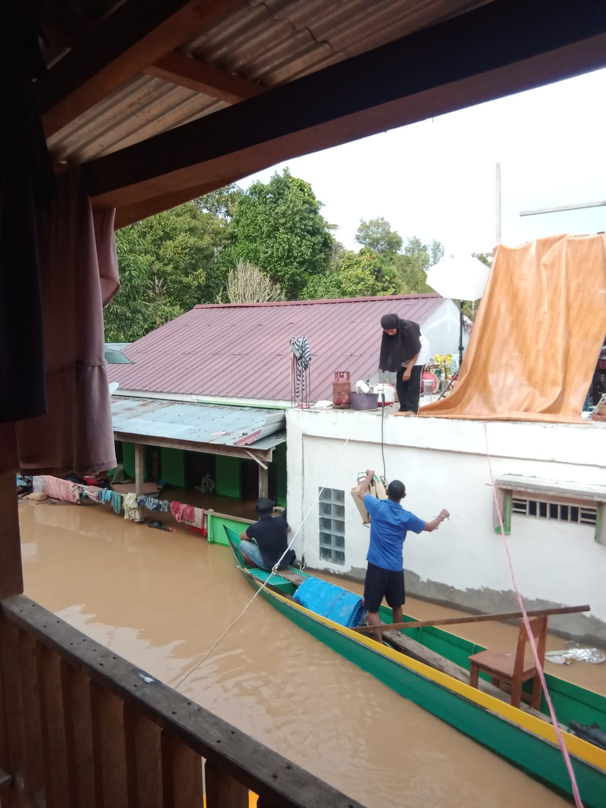Salah satu di Desa Tanjung Lapang saat mengungsikan barang ke lantai dua rumahnya.