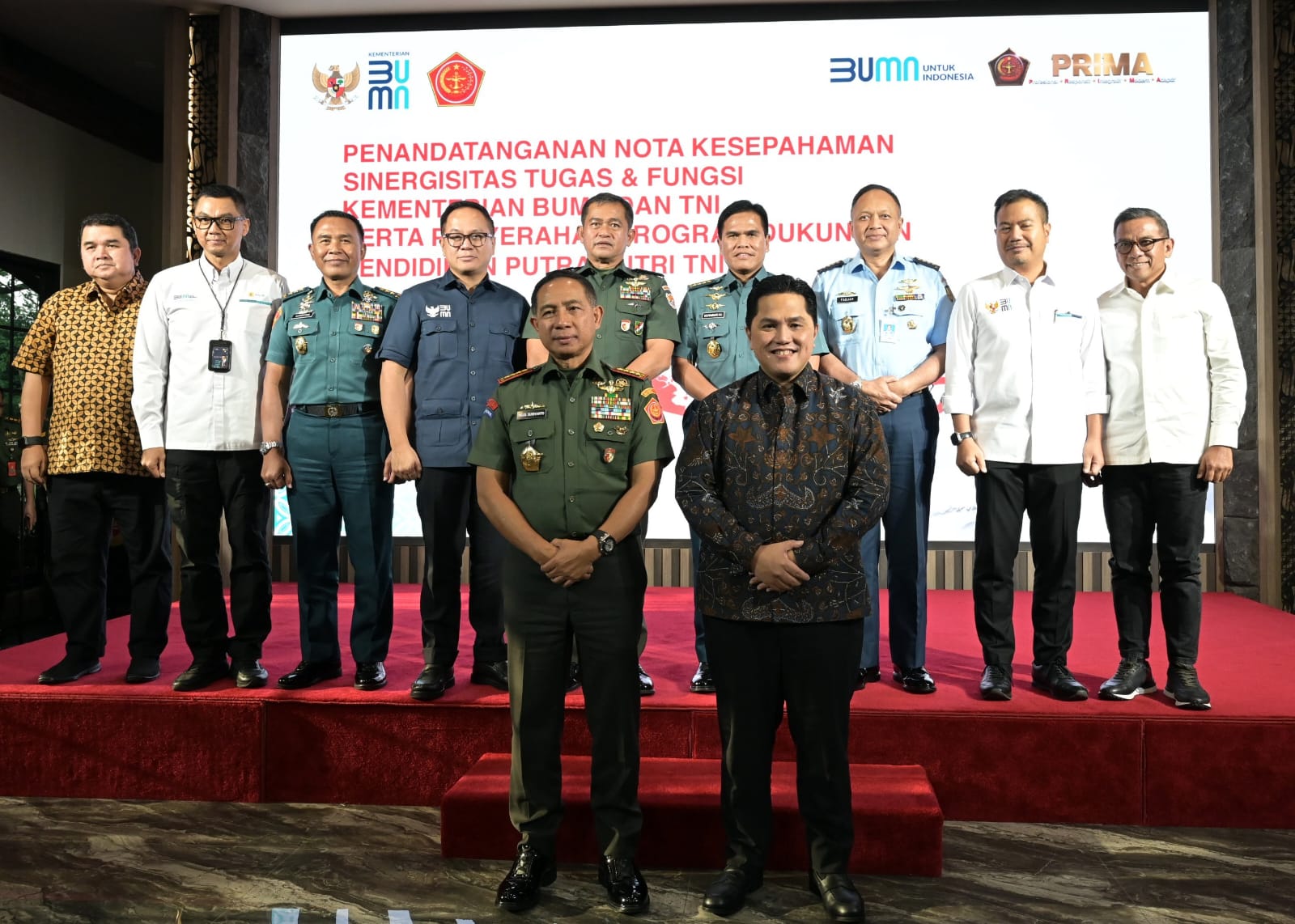 “Dengan adanya sinergi yang kuat antara BUMN dengan TNI kami yakin hal ini bisa mengoptimalkan sumber daya BUMN dan TNI termasuk pengamanan aset BUMN, sehingga tugas dan fungsi masing-masing dapat terselenggara dengan baik,” Imbuh Erick.