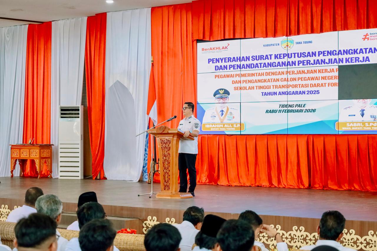 Dalam sambutannya, Bupati Ibrahim Ali menyampaikan “Selamat kepada 191 P3K paruh waktu kerja Kabupaten Tana Tidung yang pada hari ini telah resmi menerima surat keputusan pengangkatan perjanjian kerja pegawai pemerintah dengan perjanjian kerja paruh waktu lingkup pemerintah kabupaten tana tidung tahun 2026. ” ujarnya.